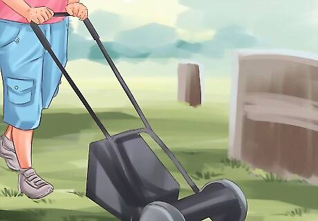Mow around markers. After the brush is cleared, the bulk of the grass in a cemetery can be mowed using a hand mower, although care should be taken to first flag the markers and not mow over them. If you hire a landscape company or other contractors to complete mowing, make sure they understand the delicate nature of the site and are willing to take precautions to avoid upsetting historic markers or destroying landscape features. Any agreements with landscapers or outside contracts should be in writing, so everyone understands the nature of the project. Use push mowers rather than riding mowers. If possible, non-motorized mowers are preferable as they create the least disturbance and lower the risk of damaging historic artifacts and grave markers.