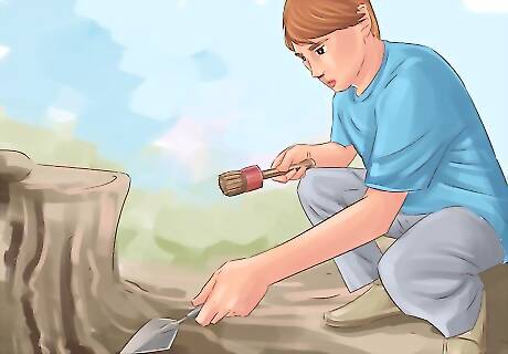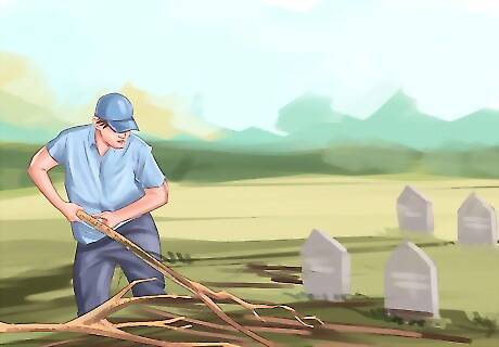 Clear brush by hand. To avoid disturbing graves or damaging markers, the bulk of the brush on the grounds of a historic cemetery should be cleared without the use of motorized clippers or mowers. Keep in mind that much of the work involved in cleaning up a historic cemetery is pain-staking and labor intensive. Rotate volunteers frequently among tasks to prevent burn-out and carelessness. Protect the safety of your volunteers by establishing rules of conduct and keeping a first aid kit on hand at all times if anyone is injured while working at the cemetery. Take note of any toxic plants such as poison oak on the grounds, and make sure anyone with responsibility for clearing brush in those areas wears protective clothing. Where possible, have professionals train volunteers so everyone working has an understanding of what constitutes brush or debris that should be removed and what stones or other material is a part of the natural order of the cemetery's design and shouldn't be disturbed.