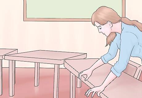 Arrange the classroom in a way that allows you to see all of the children, at all times. Make sure there are no blind spots where children can get lost from your sight. If you use cubicles or partition walls, configure them in a way that allows you to see around them from as many angles as possible. For example, it is better to put a partition wall at a right angle to a perimeter wall than it is to put 2 partitions walls at right angles to each other in the center of the room. Set up play areas in the center of the room. Arrange chairs, desks and work tables in circles.