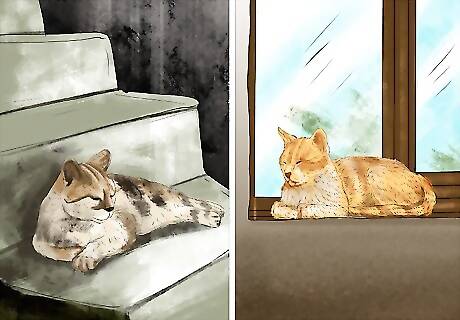 Let your cat rest on stairwells and window sills. Stairwells and window sills can act as great resting places for your cat. They provide different levels for your cat to climb, making them ideal high spots for resting and relaxing. Window sills are also good options, especially if your home has wide window sills. Keep the these areas clean and empty so your cat can rest on them as it sees fit. There are also commercial attachments for window sills that can add more space for your cat to sleep on.