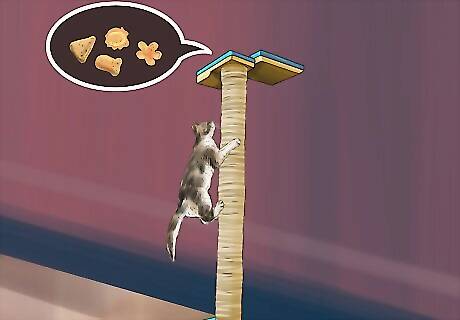 Give your cat affection and praise when it is on the post. Encourage your cat to hang out and rest on the climbing post by giving verbal praise and heavy pets when it is on the post. If you notice your cat on the climbing post, go over and give it a few good pets or verbal praise like, “Good kitty” or “That’s a good cat.” Put cat toys on the post so your cat can play with the toys when it wants to. This can encourage your cat to hang out on the climbing post for playing and for resting. To help train your cat in the beginning, you should place treats in various locations on the post. For most cats, however, there is a natural instinct to climb, and they won’t need incentives.