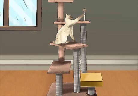 Invest in a climbing post for your cat. A climbing post usually has a least two to three shelves or resting spots, like branches of a tree. Most cats enjoy climbing and resting on a climbing post. Some climbing posts also double as scratching posts and are made of material that can be scratched or pawed by your cat. You can find climbing posts for your cat online or at your local pet store. If you have more than one cat, you may want to invest in more than one climbing post. This way, your cats will not need to fight over the same post and can have equal access to high resting places. Many climbing posts also function as “cat hotels,” which allow your cat to hide away and sleep out of sight if they want.