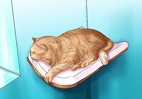 Provide high shelves for your cat to rest on. You can also provide high shelving for your cat to climb and rest. Set up shelving, such as book shelves, in your living room or bedroom and leave the top shelves empty so your cat can rest on them. Make sure there is an open pathway leading to the shelves so your cat can get on them easily. You can also create a rising pathway made of shelving so your cat can climb and rest on different levels. Put shelving of different sizes together to create an ascending row of shelves. Or use shelving of different sizes throughout your home so your cat has different levels it can rest on. Add some towels or a small cat bed to the shelves to encourage your cat to perch on them.