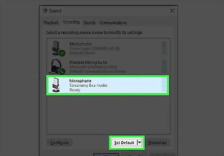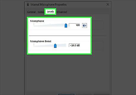 Adjust the audio levels of your microphone. You can adjust the audio levels and enhancements within the Sound Control Panel window. As you speak into your microphone you will see the volume of your microphone. Check with your microphone’s instructions for the optimal distance to speak into the microphone. If the volume appears to be too low, even at optimal settings described by the manufacturer, you can increase the volume of the microphone by right clicking on the microphone device in the Sound Control Panel window then click on “Properties” to bring up the device’s properties window. Click on the “Levels” tab and click and drag the volume slider to increase or decrease the recording volume. Click on OK to keep your changes.