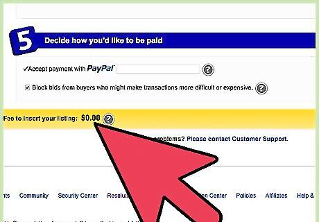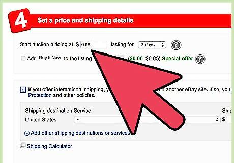 Begin your auction listings at lower prices to save on insertion fees. Insertion fees are mandatory fees that you will pay for each item you list for sale on eBay. You will pay the lowest insertion fee rates when you start your auction listing price at lower than 99 cents (0.72 euros). Insertion fees will increase gradually when you start your auctions at higher prices. For example, if you begin an auction for an item at 25 dollars (18.28 euros), your insertion fee will be 75 cents (0.54 euros); whereas an auction item you begin at 50 dollars (36.57 euros) will have an insertion fee of 1 dollar (0.73 euros). View the eBay website provided in the Sources section of this article to view the current insertion fee rates. If you create listings for fixed-price items instead of auctions, your insertion fee will always be 50 cents (0.36 euros) for items priced at 99 cents (0.72 euros) and higher.