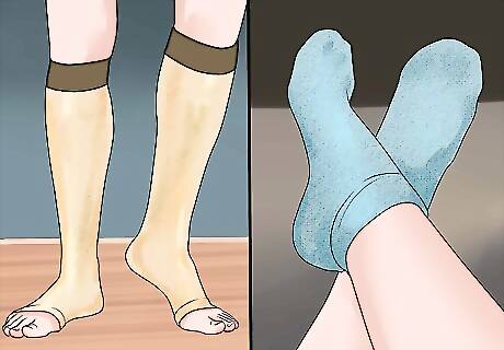 Put on compression tights or socks. Compression stockings or socks help improve blood and fluid flow in your legs. Wear a pair of compression garments to help reduce your edema. Depending on the severity of your edema, you can get different pressures of stockings — from light to strong. You don’t need a prescription from your doctor to purchase compression stockings, but you may want to consult with her to see if it is a good option for you. You may be able to get your insurance to pay for compression stockings. You can get compression garments at many pharmacies and most medical supply stores.