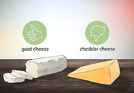 Use soft or reduced-fat cheese instead of hard or full-fat cheese. Fresh or soft cheese, such as feta, goat cheese, or cottage cheese, contains less fat than hard aged cheese like Parmesan or cheddar. If you don't want to compromise flavor, you could use reduced-fat versions of these cheeses. You should also try to reduce the amount of cheese you use when you cook. For example, save it for a garnish instead of adding it to a sauce.