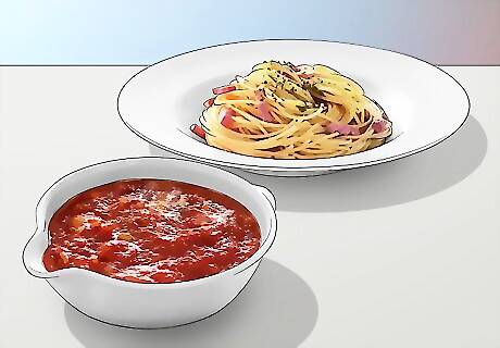 Flavor pasta or casserole with marinara instead of cream sauce. Many decadent pastas or casseroles are high in fat because they're loaded with cream, cheese, and red meat. Swap out tomato-based marina sauce for the creamy cheese sauce. You'll get brighter flavor and a serving of vegetables while cutting back on the fat. Add extra vegetables by stirring in sautéed mushrooms or steamed spinach.