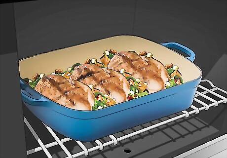 Roast or broil meat and vegetables to get rich flavor that's low in fat. Start by trimming the meat of visible fat and place it in a roasting dish with vegetables. If you're making a large piece of meat, cook it at low heat for a long time so the meat tenderizes. To cook thinner cuts of meat or vegetables, place them on a sheet about 3 inches (7.6 cm) below a broiler and broil them until they're as cooked as you like. Keep in mind that thin cuts of lean meat should usually be cooked quickly so they don't become tough.