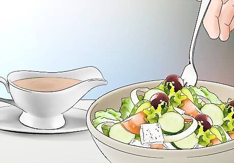 Put dressings or sauces on the side. If you're ordering food, ask to have the dressing or any sauces served next to the salad or dish. This will give you more control over how much you eat. Try spearing some of the salad or food on your fork and dipping a little of it into the dressing or sauce. You'll probably find that you use less than if you poured the dressing or sauce over your food. To make lower-fat choices, pick vinaigrettes instead of very sweet or creamy dressings. If you really enjoy creamy dressing, look for one made with yogurt or buttermilk.