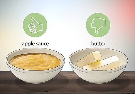Substitute fruit or vegetable puree for the fat in a baking recipe. Cut back on fat while adding moisture and flavor to your baked goods. Try substituting puree, such as applesauce, pear sauce, or canned pumpkin, for all of the butter or oil in cakes, muffins, and quick bread. Applesauce is a great fat replacer in cake, muffins, and cookies. Try shredding zucchini to use in brownies or chocolate cake.