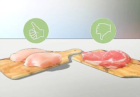Go with lean meats and other protein sources instead of red meat. Red meat is higher in fat than lean meat, such as skinless chicken or ground turkey breast, so try to substitute or replace some of the red meat you eat. Incorporate other forms of protein, such as seafood, beans, or tofu, that are lower in fat, for instance.Tip: Canadian bacon is a great low-fat substitute for bacon or pepperoni. For example, instead of making chili with ground beef, you could use ground turkey breast or use half of the recommended amount of ground beef with black beans.