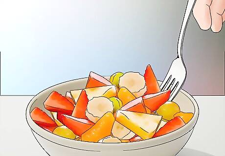 Replace fried snacks with whole grains or fresh produce. If you frequently snack on chips, crackers, or pastries, try to eliminate them from your diet and eat healthy snack instead. Keep healthy choices, such as chopped fruit, vegetable sticks, plain pretzels, or unbuttered popcorn. If you like to snack on nuts, limit yourself to a small handful since these are naturally high in fat.