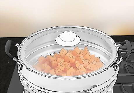 Steam meat and veggies to create tenderness without the fat. Instead of cooking meat and vegetables in fat, such as butter or oil, cook it in water! Heat about 1 inch (2.5 cm) of water in a pot until it starts simmering and producing steam. Then, put your food into a steamer basket and set it into the pot. Put the lid on and steam the food until it's tender and cooked throughout.Variation: If you don't have a steamer basket, heat 2 to 3 tablespoons (30 to 44 ml) of water in a covered skillet. Once it starts to steam, add the food so it's in a single layer. Then, put the lid on and steam the food until it's tender. The bottom of the steamer basket shouldn't be touching the water or the food will boil instead of steam.
