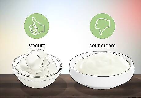 Swap plain yogurt for sour cream or mayonnaise. You can use low-fat, nonfat, or Greek yogurt in most recipes that call for sour cream or mayonnaise. If you're not ready to give up sour cream yet, try switching to a reduced-fat version. Yogurt even works as a substitute for mayonnaise in cold salad recipes, such as tuna or chicken salad. You could also try low-fat ricotta instead of full-fat sour cream.