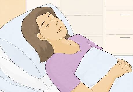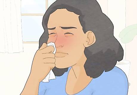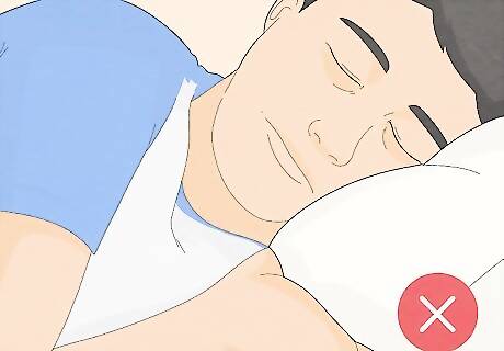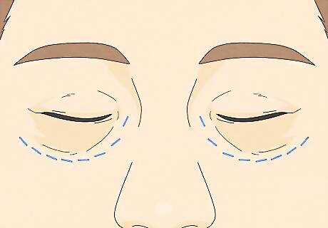 Prop your head up while you sleep. Instead of lying perfectly flat with your head on a small pillow, stack a few pillows on top of one another so that you sleep with your upper body at a raised angle. This can make it easier for the fluids that accumulate under your eyes to drain at night, since gravity will help pull them down away from your face.