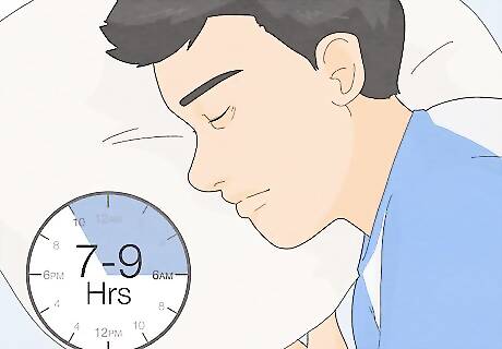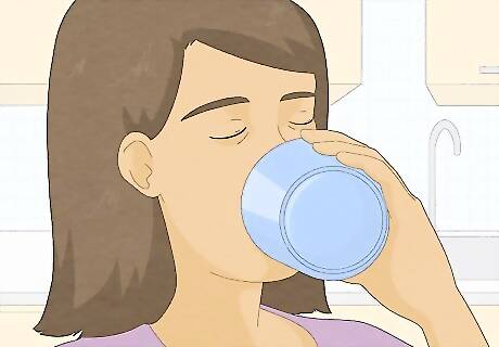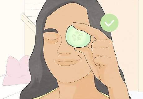 Drink more water and consume less alcohol. Dehydration can cause blood to build up under your eyes, so drinking plenty of water during the day may reduce this puffiness. In addition, since alcohol causes you to urinate more often, it can leave you dehydrated after a long night of drinking. As a result, drinking more water during the day and cutting back on alcohol before bed may make your eyes less puffy over time. Cutting down on the amount of fluid you consume in the hour or two before bed may help as well. Don’t avoid drinking water if you’re thirsty or anything like that, but just be conscious of how much fluid you’re consuming.
