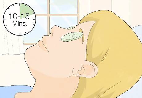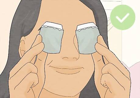 Lay a cold compress over your eyes for a few minutes. Grab a cold compress and wrap it in a cloth. Lie down and rest the compress over your eyes. Keep your eyes closed and just relax for 10-15 minutes or so. The cold compress will soothe any inflammation and reduce the blood flow under your eyes; this should minimize the overall appearance of the bags. You can use cold cucumber slices, tea bags, or refrigerated spoons if you’d like. These things may help your skin rehydrate or relax, but it’s probably not going to make a huge difference. The key thing is that whatever you’re putting over your eyes is cold.
