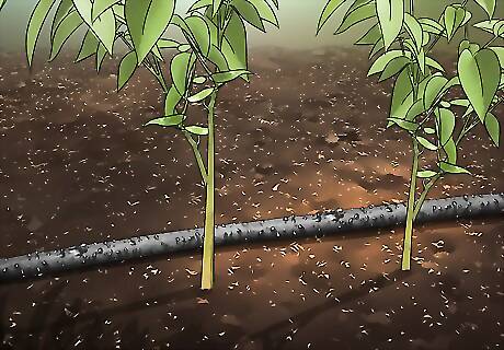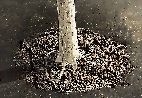 Apply mulch liberally around plants and trees to conserve water. Spread the mulch a few inches away from the base of your plants and water it thoroughly. Mulch promotes healthy growth, prevents runoff, and smothers weeds. It even insulates root systems during particularly hot or cold stretches of weather. Shredded hardwood, pine straw, and recycled leaf mulches are among the most popular varieties used by environmentally-conscious gardeners. Avoid piling your mulch any higher than about 3–4 inches (7.6–10.2 cm). Too thick a layer can interfere with the absorption of water and nutrients.