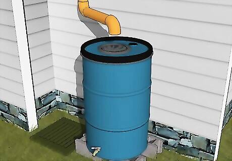 Collect and store rainwater in barrels. Set up your barrels near your garden so that you’ll always have a fresh supply of water close at hand. You can use this water to fill watering cans and give thirsty plants, trees, and crops just as much moisture as they need rather than letting the hose run interminably. If you live in an area that receives sparse precipitation, situate your rain barrels under a downspout to help them fill up faster. Rainwater can even be used for drinking once it’s been properly purified.