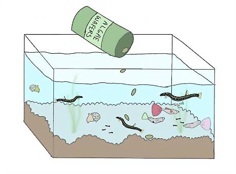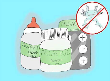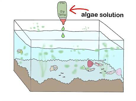 Use solutions carefully, and avoid them with sensitive fish. An algae solution is an unnatural liquid, powder or tablet that is put into fish tanks to clear away algae. Solutions are not as gentle to your fish as hand cleaning your tank or adding bottom betters, but they do work very well and are fast. Avoid using a solution if you own a fish that is sensitive to chemicals such as an axolotl.
