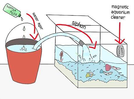 Tackle any pollution issues with a water change. If your tank is polluted, then perform a water change and siphon the gravel using these simple steps. Take out 30 - 50% of the water in your fish tank using a siphon. Fill a bucket with water (making sure that the water temperate is the same as the water temperature inside your tank ). Stir in the required amount of water ager into the water (it should say it on the back of the bottle or under the label). Gently pour it in or use a siphon instead. Try to be gentle so your fish won't stress out. Repeat this until your tank is full (but not completely to the top). After this, use your siphon to suck out any poo or excess food from the gravel.
