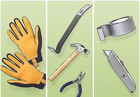 Get the necessary tools for the job. Before you start ripping up that carpet with nothing but elbow grease and ambition, it's best to get prepared for the job by getting all the tools you'll need to do it right. There's nothing expensive required, and everything should be available at any hardware store: Heavy duty leather gloves with a padded palm are essential to keeping you hands safe. You might encounter sharp nails or tacks while pulling up carpet, and a good pair of gloves will also help you grip the carpet. A dust-mask is also a good protective barrier to use, especially if you have asthma or other respiratory problems. To pry up the carpet and tacks, you'll need a pry bar, pliers, and a hammer. While you can start ripping the carpet up with your hands, getting it started and tearing it free will require some help. To keep the job clean, it's also good to have a roll of duct tape to roll up the carpet and move it after you've cut it loose, as well as a utility knife to cut strips of carpet.