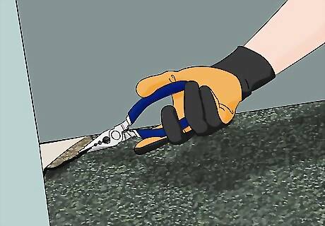Grab one corner of the carpet and pull it up from the floor. When you've selected your starting point, grip onto the carpet with your pliers and tug upward firmly. Don't jerk too hard, or you may rip the carpet and have to start over. Once you get a good chunk of it up, you can use your hands to start pulling backward.