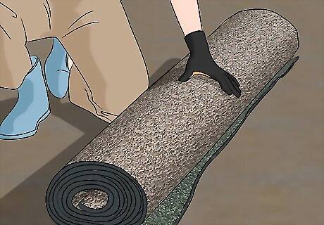 Use the pry bar to work under the carpet. From the corner, work the pry bar along both edges, helping to ease the carpeting up and away from the floor. There will likely be carpet tacks that will be quite sticky, making it a lot easier to use the pry bar. Continue pulling and using the bar to separate the carpet from the floor as evenly as possible. Remove the carpet tacks as you find them. Look for tacks that might be attached to the bottom of the carpet. Use a pry bar and run it across the bottom of the carpet to ensure they come off before you roll it up.