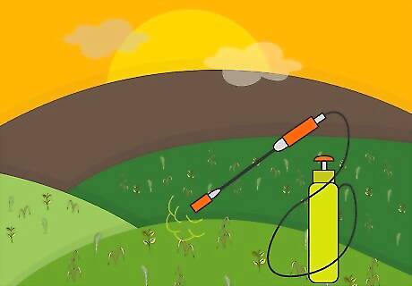 Kill larger patches with a 1–2 gallons (3.8–7.6 L) tank. If the weeds on your lawn have grown into patches that are too large for a spot killer, you’ll need a large volume of weed killer to remove them. Purchase a 1–2 gallons (3.8–7.6 L) tank at your local hardware store or gardening center. Then, walk through your yard and spray the chemical onto weed patches from a height of about 4 inches (10 cm). Like the spot-killer applicator, these tanks will be pressurized. Most large tanks will have a handle on top, although some may have 1 or 2 straps so you can hook the tank over your shoulders.