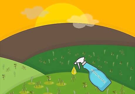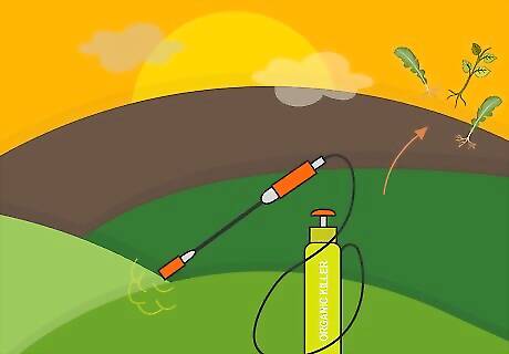 Spray organic killer liberally on your lawn if the weeds have taken over. If your lawn is completely overrun by multiple varieties of weeds, the best approach may simply be to kill all of the plants, grass and weeds alike. In this case, spray an organic killer over a large area of weed-infested lawn. A few days later, you can walk over the lawn and pick out all the dead weeds. You can then reseed the ground so that a healthier and weed-free lawn will grow next year.