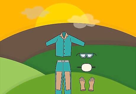 Wear clothing that protects your eyes, mouth, and skin while applying weed killer. Weed killers contain harmful chemicals and should be treated accordingly. Wear eye protection while spraying your lawn. To prevent yourself from inhaling chemicals, wear a surgical mask or bandana over your mouth. Wear long sleeves, long pants, and rubber gloves to keep weed killer off of your skin. If you have young children or pets in your home, keep them off of the lawn for 24 hours following the application of chemical spray. Weed killers could harm children or pets who accidentally ingest any of the chemicals.