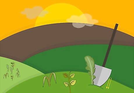 Press a trowel or dandelion digger into the soil near the base of the root. The blade of the trowel or digger should be at about a 65° angle—not quite vertical, but largely upright. Drive the tool into the soil about 4–5 inches (10–13 cm) to loosen the soil surrounding the weed’s roots. Repeat this 3 or 4 times, loosening the soil on all sides of the root. Trowels and dandelion diggers can both be purchased at a local plant nursery or gardening center. Both should cost less than $5 USD.