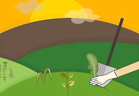 Grasp the stalk of the weed at its base. To properly remove a weed, you need to pull it out by the root. Hold the base of the weed firmly, using your full hand—don’t just pinch the stalk of a weed using 2 fingers. If you’re pulling up a clump of weeds, grasp the entire clump at its base. Perennial weeds like dandelions can be plucked most effectively in early spring. If left to grow until summer, the dandelions will have put down thick taproots.