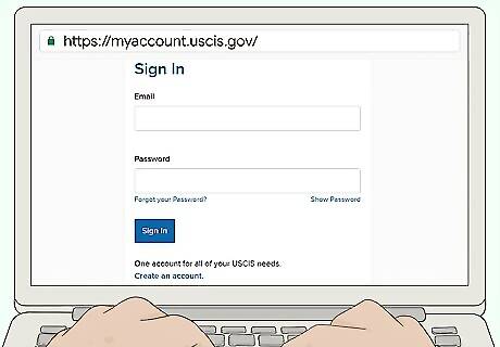 Log in or create an account at the USCIS website. Go to https://myaccount.uscis.gov/ log in to your account. If you don't have an online account, you can set one up from the same page. Just click the "Create an account" link. To create an account, you'll need a valid email address. USCIS will use that email address to send you confirmation notices, status updates, and other communication regarding your account.