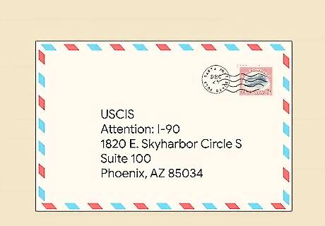 Mail your application to the appropriate filing location. Get together your application, fee payment (or waiver application), and photocopy and send them in one package to the USCIS Lockbox Facility. Before you seal the envelope, make sure you've signed your application. USCIS will reject your application automatically if it isn't signed. If you're using USPS, send your application packet to USCIS, PO Box 21262, Phoenix, AZ 85046. If you're using a private delivery service, such as FedEx, UPS, or DHL, send your application packet to USCIS, Attention: I-90, 1820 E. Skyharbor, Circle S, Floor 1, Suite 100 Phoenix, AZ 85034.Tip: When your paper application is received, your materials will be scanned for digital processing. If you don't already have an online USCIS account, one will be created for you. You'll get a welcome packet in the mail with instructions on how to access your account.