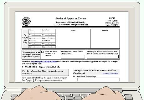 Complete Form I-290B, Notice of Appeal or Motion. You can download the form at https://www.uscis.gov/i-290b. Fill it out completely, either by typing your answers into the form on a computer or printing legibly in blue or black ink. If you don't understand something on the form, ask an immigration lawyer to assist you. If there is a nonprofit immigration organization near you, they may also be able to help you.