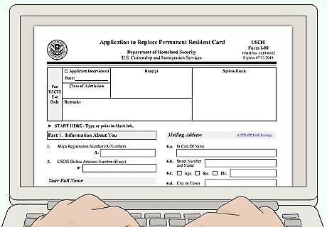 Complete Form I-90, Application to Replace Permanent Resident Card. Download the form at https://www.uscis.gov/sites/default/files/files/form/i-90.pdf. You can either type your answers directly into the form using your computer or you can print the form and fill it out by hand. If you fill the form out by hand, print legibly using blue or black ink. The form asks for information to establish your identity. If you don't have any of the information asked, you can leave those questions blank. However, you should try to answer as many of the questions as you can.
