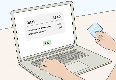 Pay the fee to submit your application. Once you've signed your application, the website will redirect you to Pay.gov. Pay your application and biometrics fees using a US bank account or any major debit or credit card. You will then be redirected back to the USCIS website to confirm submission of your application. As of 2019, the fees for a replacement Green Card are $455 for the form and $85 for biometric services, for a total of $540. If you cannot afford the fee, you can apply for a fee waiver. However, you won't be able to apply online if you're requesting a fee waiver.