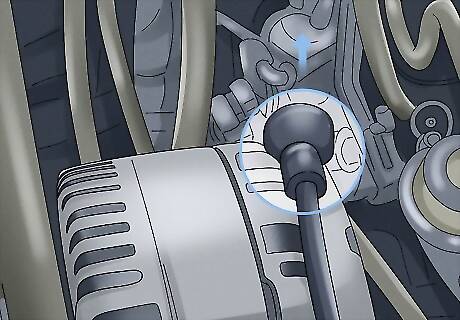 Remove black dust boot from the top of the alternator (just wiggle it back off where it is). Take off the nut hiding under there, and lay the wire to the side. Thread this nut back in place once you have the wire off so it doesn't get lost somewhere.