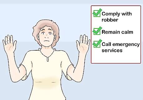 Protect yourself. If you are at home when it is broken into, then get to a safe place. Also protect yourself if someone tries to rob you in a parking lot or in another public space. You can protect yourself by complying with the robber and remaining calm. Robberies typically happen very quickly. If you were hurt during the robbery, then you should seek immediate medical attention. Call your local emergency services to request an ambulance, or else you can have someone else take you to the emergency room.
