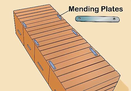 Place mending plates where the crates come together. Mending plates are rectangular metal parts with two holes on either side. They’ll secure your crates together. Put the mending plates perpendicular to each juncture, using two for each. Place them about an inch (2.5cm) away from the edge of the crate.