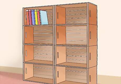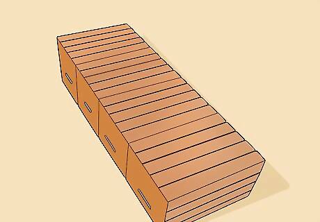 Lay the crates down, bottoms up. You should lay them so they’re touching each other, arranged in the shape of the bookshelf you’re looking to build. Only the crates should be pointing away from you, the opening touching the floor. The simplest method is to stack three or four crates together in a straight line, but you can experiment with different layouts.
