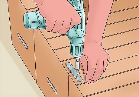Use a drill to screw in the mending plates. If you’re using a softer wood, like pine, you may want to predrill your holes. Otherwise, just use half-inch (1.3cm) screws to fasten the mending plates to the crates