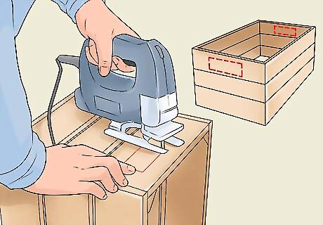 Cut handles into the side panels. Start by drawing rectangles on either side of the crates with a pencil, near the top of the shortest sides. The handles shouldn’t be much wider than a third of the width of your crate. Use a jigsaw to cut out the handles, following your pencil lines. If the crates you have already have handles cut into them, you can skip this step.