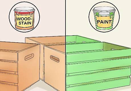 Paint or stain the crates. Depending on the look you’re going for, you’ll either want to paint or stain the crates. If you want the crates to keep their wooden look, you’ll want to stain the wood. If you want your bookshelf to be brightly colored, you’ll want to paint the crates. Before building the bookshelf, you should let the crates dry. This can take several hours.