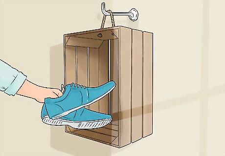 Make simple shelving. Wooden crates with cracks or holes on their smallest sides are best for this project. Pass a rope through the crate’s small sides, so that it rests against the top of the crate. Install a hook on your wall and hang the crate onto it. If the crate you’re using doesn’t have holes, you can drill them into the sides.