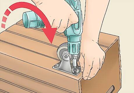 Flip the wooden crate upside down and screw on four wheels. You’ll need to get casters, which are small wheels specifically for furniture and crates. The wheels are attached to a small metal plate with holes, designed to be screwed into another object. You’ll want to use a drill to screw the wheels into the bottom of the crate, one for each corner.