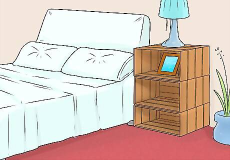 Stack crates to make a cheap nightstand. This project doesn’t require much work. Simply find three wooden crates and stack them next to your bed. They don’t have to be stacked perfectly, in fact offsetting them a bit will give the nightstand a better look. You can stain or paint the wooden crates to better fit with your decor. Make sure to do so before stacking the crates or placing them in the bedroom.