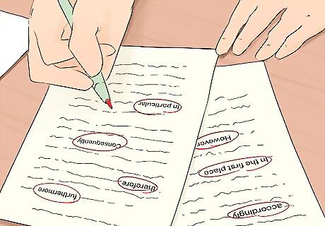 Circle transition words between sentences and paragraphs. Read your work out loud to get a sense of its flow and cohesiveness, and mark the words that signal the places where you connect 2 ideas. If you don’t have many, insert transitional words, like “accordingly,” “furthermore,” and “therefore,” at the beginning of related sentences to avoid abrupt changes in thoughts and ideas. Make sure each of the paragraphs relate to each other in some way. Additionally, check sentences within paragraphs to make sure the ideas are related and work together to support the point of the piece.
